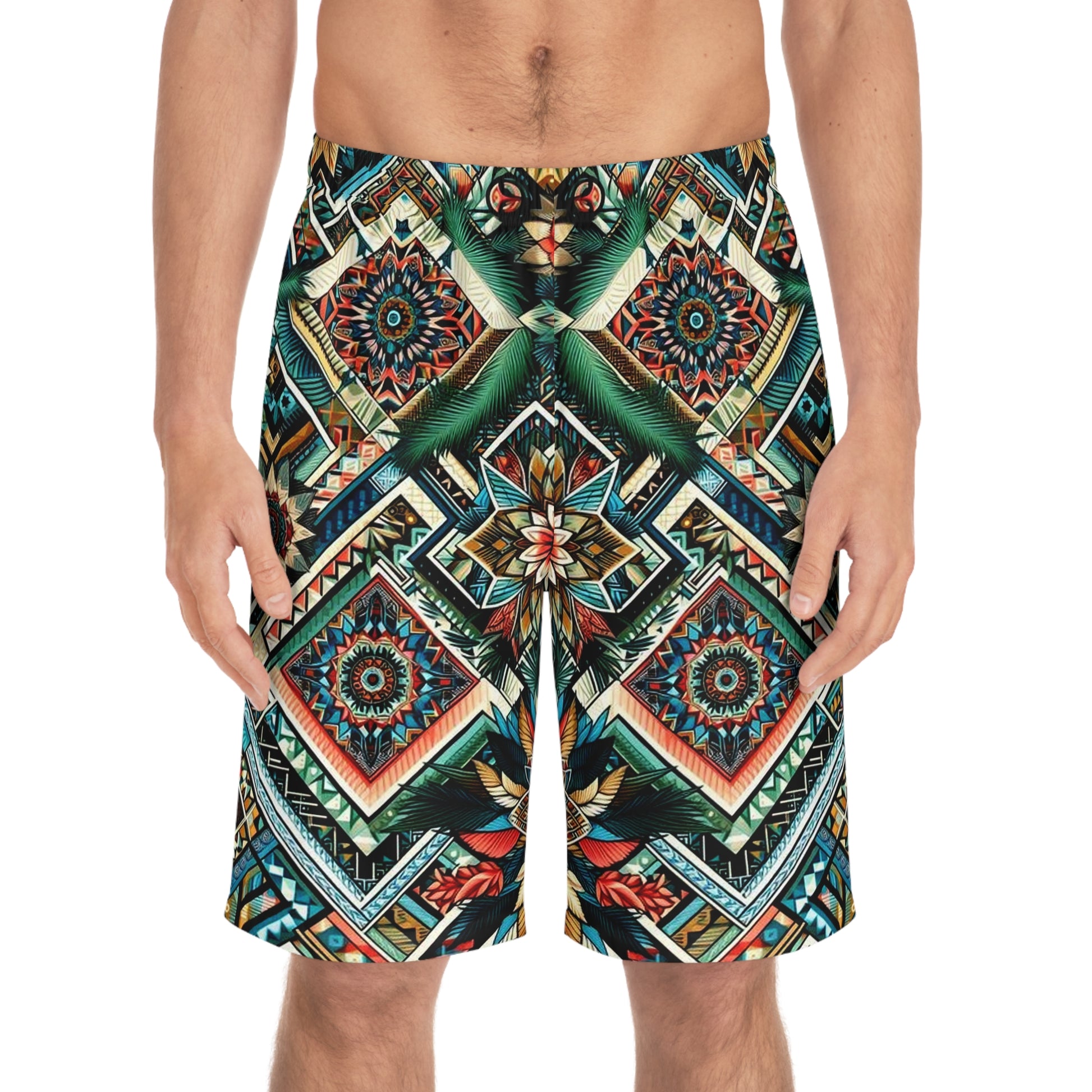 Add a personalized touch to your wardrobe with these custom board shorts for men. Made with light, breathable polyester fabric, these shorts feature 2 side pockets for daily convenience, an elastic waistband, and a black drawstring.