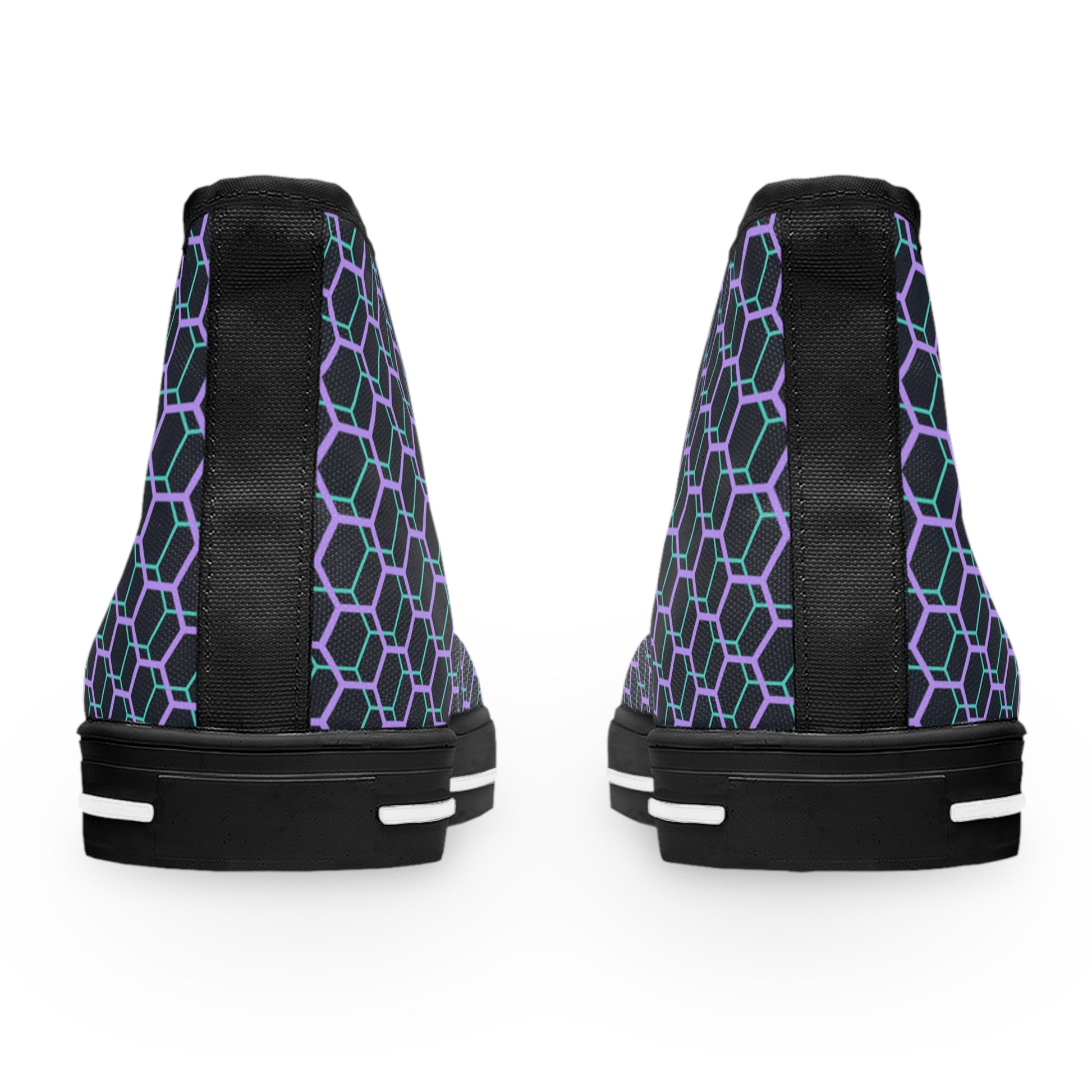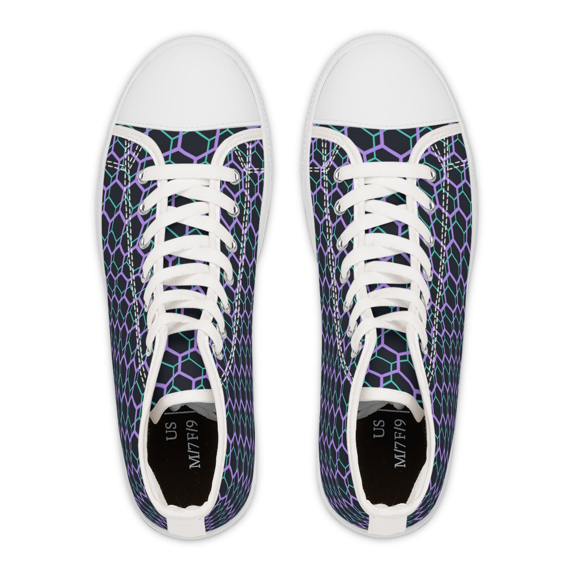 Made with breathable polyester canvas and featuring hi-poly deodorant memory foam insoles, these women's high top sneakers bear all the marks of an awesome shoe. Choose between black or white sole and laces, and enjoy the silver metal eyelets along with the lace-up closure.