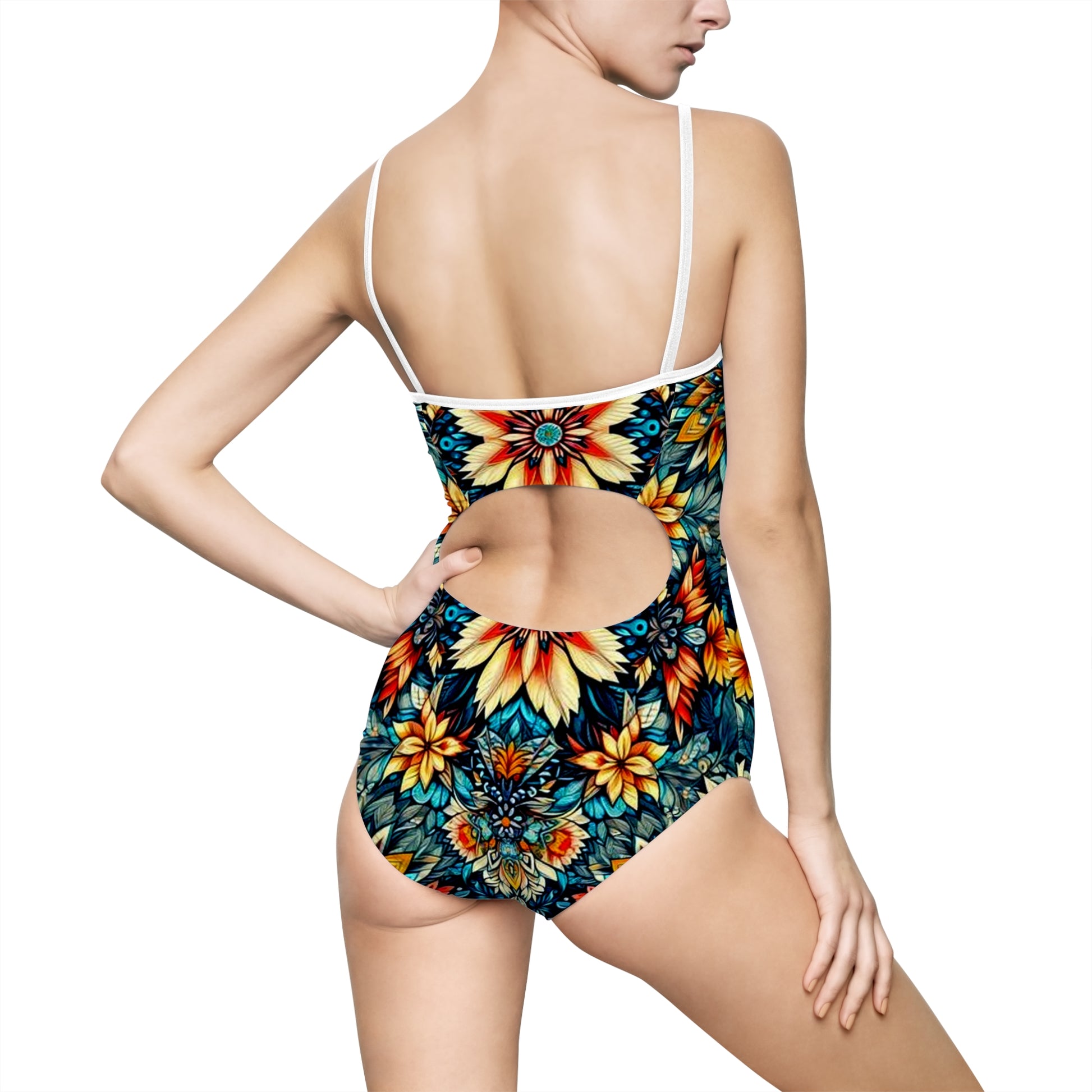 The Juicy Clams Spaghetti Strap One-Piece Swimsuit is designed for fashion-conscious swimmers. It features a hollowed-out backing. The fabric construction is 85% polyester and 15% spandex. This combination is ideal for displaying the vivid colors. There is an elastic component near the chest area designed for extra support.
